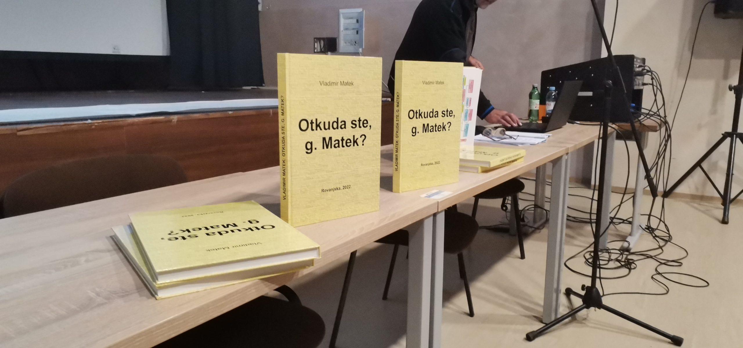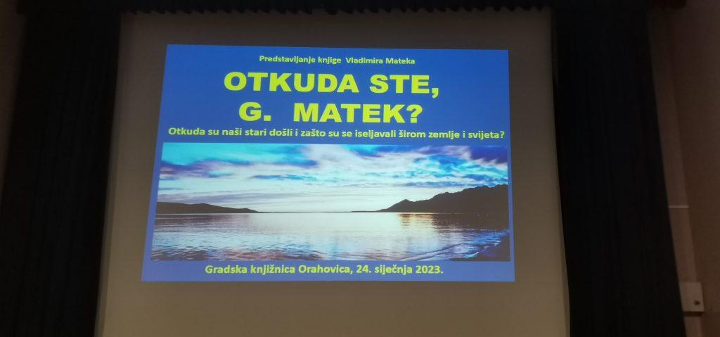 Jučer je u orahovačkoj multifunkcionalnoj dvorani održana promocija knjige pod nazivom “Otkuda ste g.Matek”, novinara i diplomata Vladimira Mateka. U ovoj knjizi na gotovo 280 stranica s mnoštvom ilustracija autor donosi zanimljive podatake o porijeklu prezimena Matek, vrlo čestog u Orahovici i okolici, te o povijesti svih četiriju skupina hrvatskih Mateka koji su i rodoslovno obrađeni nekoliko stoljeća unatrag, kao i o tome kamo su se sve i zašto selili. Kako je autor rekao, istraživanje je napravljeno s ciljem da bi se razjasnilo od kada i otkud su preci triju grana jaseničkih Mateka stigli pod Velebit, zatim da bi se utvrdilo kakvo je srodstvo između njih, te da bi se provjerilo postoji li makar daleka rodbinska veza s ostale tri skupine Mateka u RH.