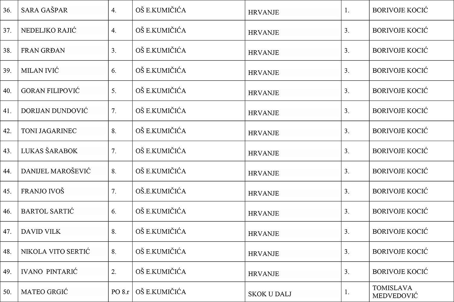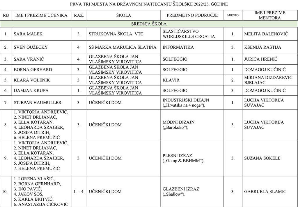 - Mateo Grgić, učenik osmog razreda OŠ Eugena Kumičića Slatina – prvak Hrvatske u skoku u dalj (Mentorica: Tomislava Medvedović)