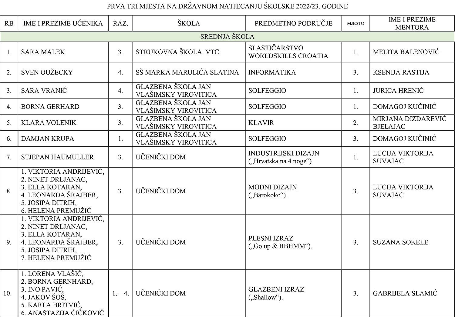 - Sara Malek, učenica trećeg razreda Strukovne škole Virovitica – prvakinja Hrvatske u slastičarstvu (Mentorica: Melita Balenović)