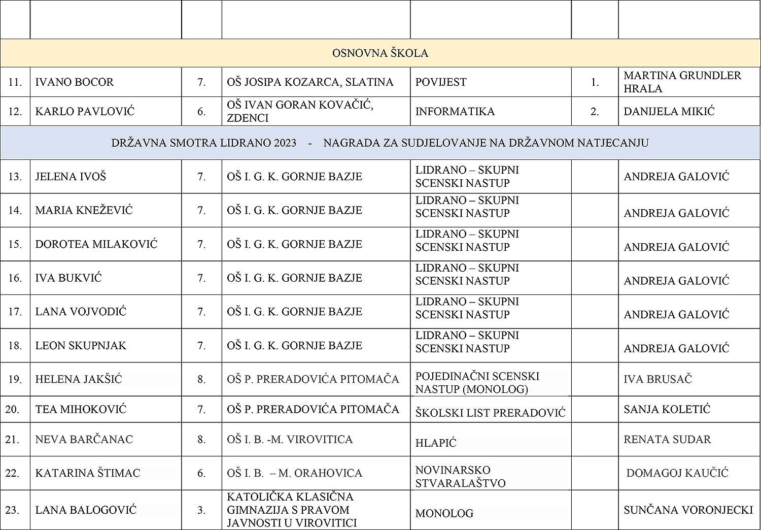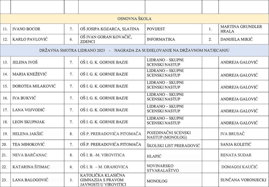 - Ivano Bocor, učenik sedmog razreda OŠ Josipa Kozarca Slatina – prvak Hrvatske iz povijesti (Mentorica: Martina Grundler Hrala)
