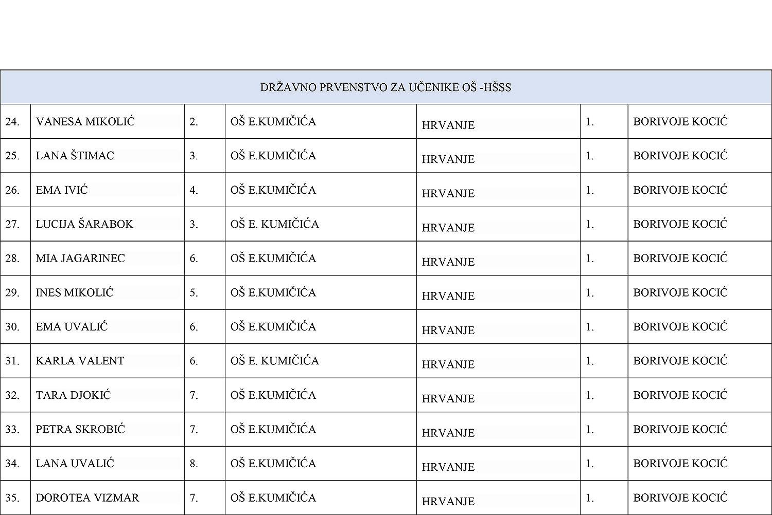 - Učenice OŠ Eugena Kumičića Slatina – prvakinje Hrvatske u hrvanju – Vanesa Mikolić, Lana Štimac, Ema Ivić, Lucija Šarabok, Mia Jagarinec, Ines Mikolić, Ema Uvalić, Karla Valent, Tara Đokić, Petra Škrobić, Lana Uvalić, Dorotea Vizmar, Sara Gašpar (Mentor: Borivoje Kocić)