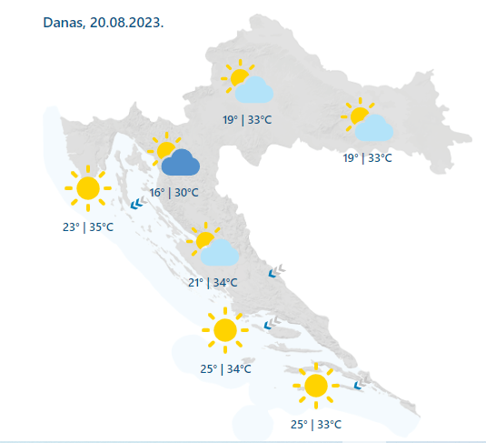 Prema prognozi DHMZ-a danas nas očekuje pretežno sunčano i vruće vrijeme. Sredinom dana je uglavnom u gorskoj Hrvatskoj uz lokalni razvoj oblaka moguće malo kiše ili poneki pljusak. Vjetar na kopnu većinom slab. Najviša dnevna temperatura većinom između 30 i 35 °C.