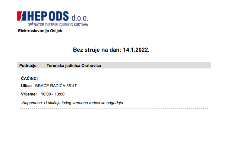 Čačinci Naslovnica Obavijest iz HEP-a za sutra Danijela Kalem 13. siječnja 2022. About Post Author Danijela Kalem See author's posts Continue Reading Previous: COVID-19 u RH: Danas 9157 slučajeva zaraze, umrle 23 osobeNext: Županijski preventivni program „Kako ne utopiti mladost u alkoholu“ ulazi u drugu godinu provedbe Related Stories Čačinci Branitelji i djeca zajednički obilježili 34. obljetnicu 2. bojne 132. brigade na tradicionalnom ribolovnom natjecanju u Čačincima radio orahovica 4. listopada 2025. Čačinci Važna obavijest mještanima općine Čačinci: Prevencija afričke svinjske kuge (ASK) radio orahovica 3. listopada 2025. Čačinci Događanja Obilježavanje 34. obljetnice 2. bojne 132. brigade HV uz ribolovno natjecanje u Čačincima radio orahovica 3. listopada 2025.
