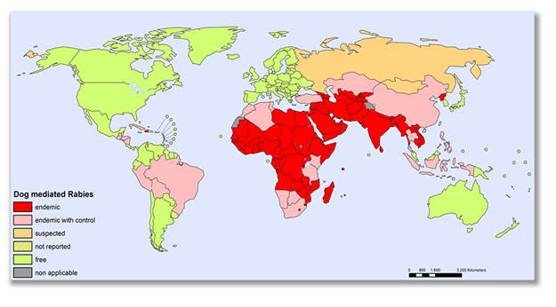 Slika 2 Pojavnost bjesnoće u pasa (urbana bjesnoća) na globalnoj razini 2025., izvor FLI, Rabies Bulletin https://www.who-rabies-bulletin.org/site-page/occurrence-rabies