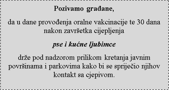 U slučaju ugriza ili ogrebotine od psa, mačke, lisice ili neke druge divlje životinje postoji RIZIK za infekciju s virusom BJESNOĆE. U takvim slučajevima nužno je odmah temeljito OPRATI RANU s puno sapuna i tekuće vode te se što prije javiti LIJEČNIKU ili najbližoj antirabičnoj jedinici kako bi se pravovremeno poduzele sve potrebne mjere.