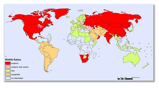 Slika 1 Pojavnost bjesnoće u divljih životinja (silvatična bjesnoća) na globalnoj razini 2025., izvor FLI, Rabies Bulletin https://www.who-rabies-bulletin.org/site-page/occurrence-rabies