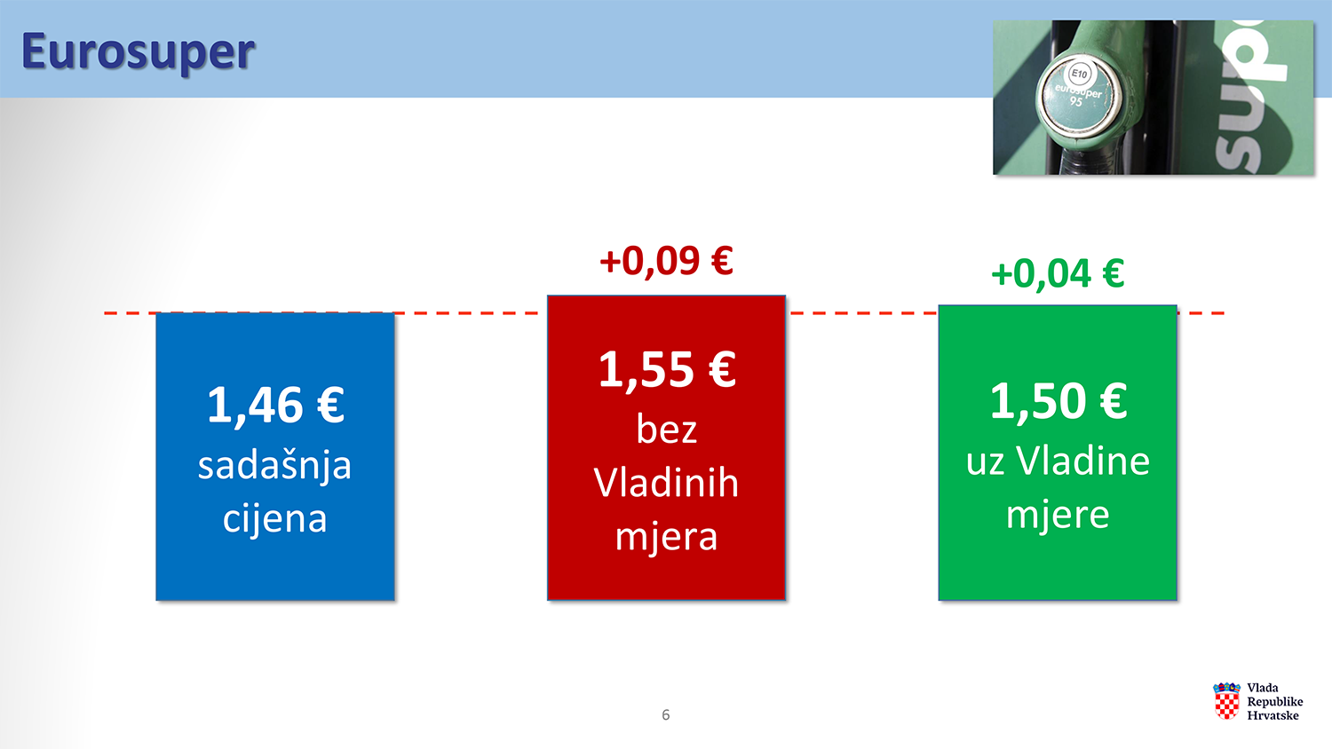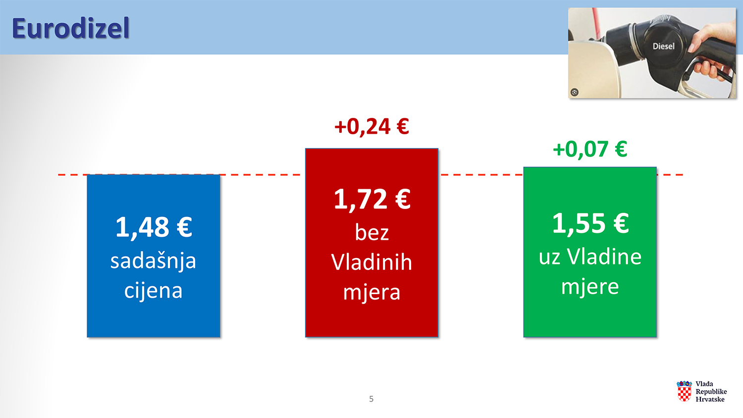 Naime, trenutna prosječna cijena eurodizela bez aditiva iznosi 1,48 eura po litri, dok bi bez Vladinih mjera cijena sutra porasla na 1,72 eura, odnosno za 24 eurocenta po litri.