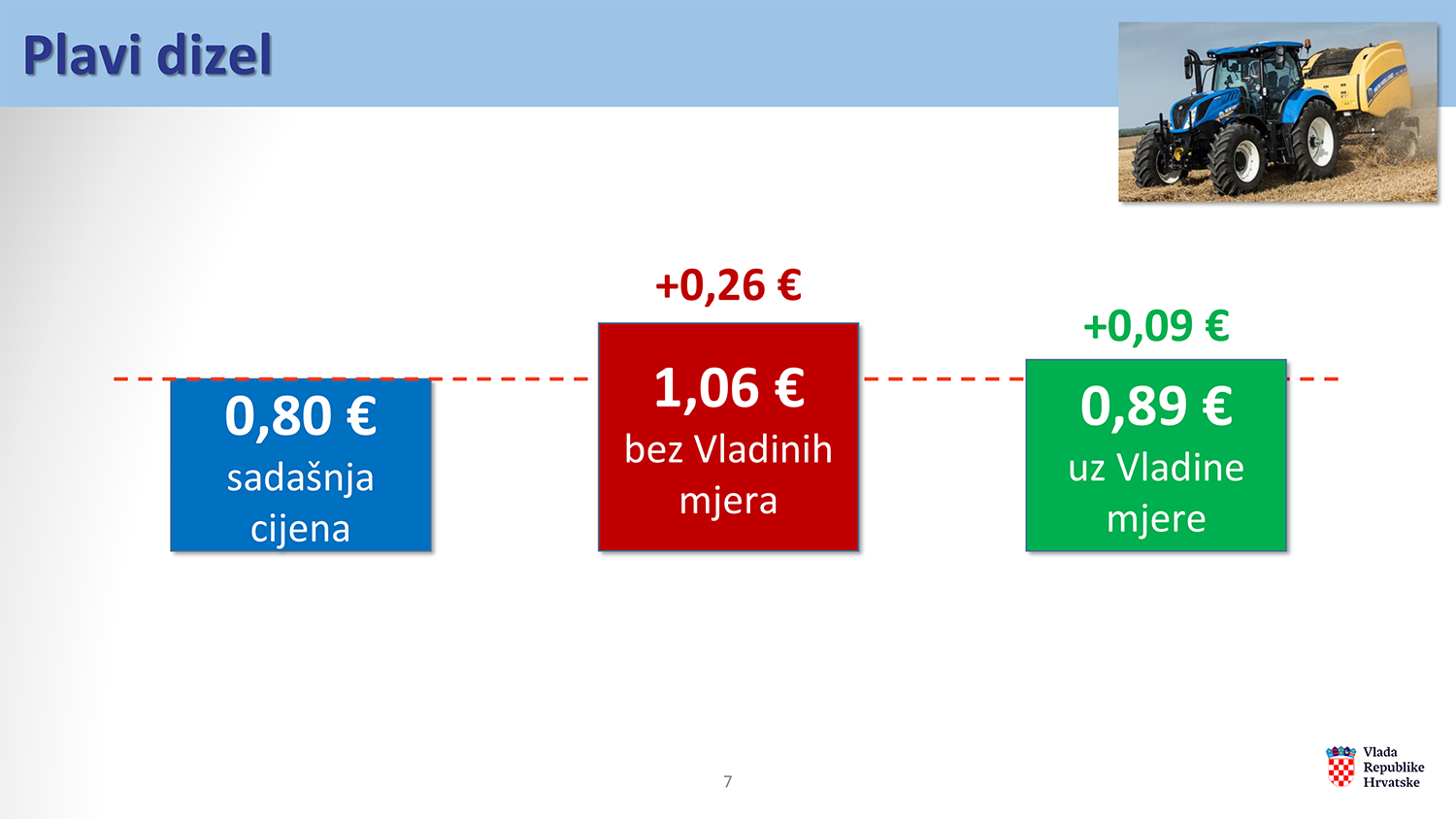 Kada je riječ o plavom dizelu, koji je izuzetno važan za poljoprivredu i ribarstvo, sadašnja cijena iznosi 0,80 eura, dok bi bez mjera porasla na 1,06 eura. Vladine mjere ograničit će rast na 0,89 eura, odnosno rast će iznositi 9 eurocenta, što je 17 centi manje.