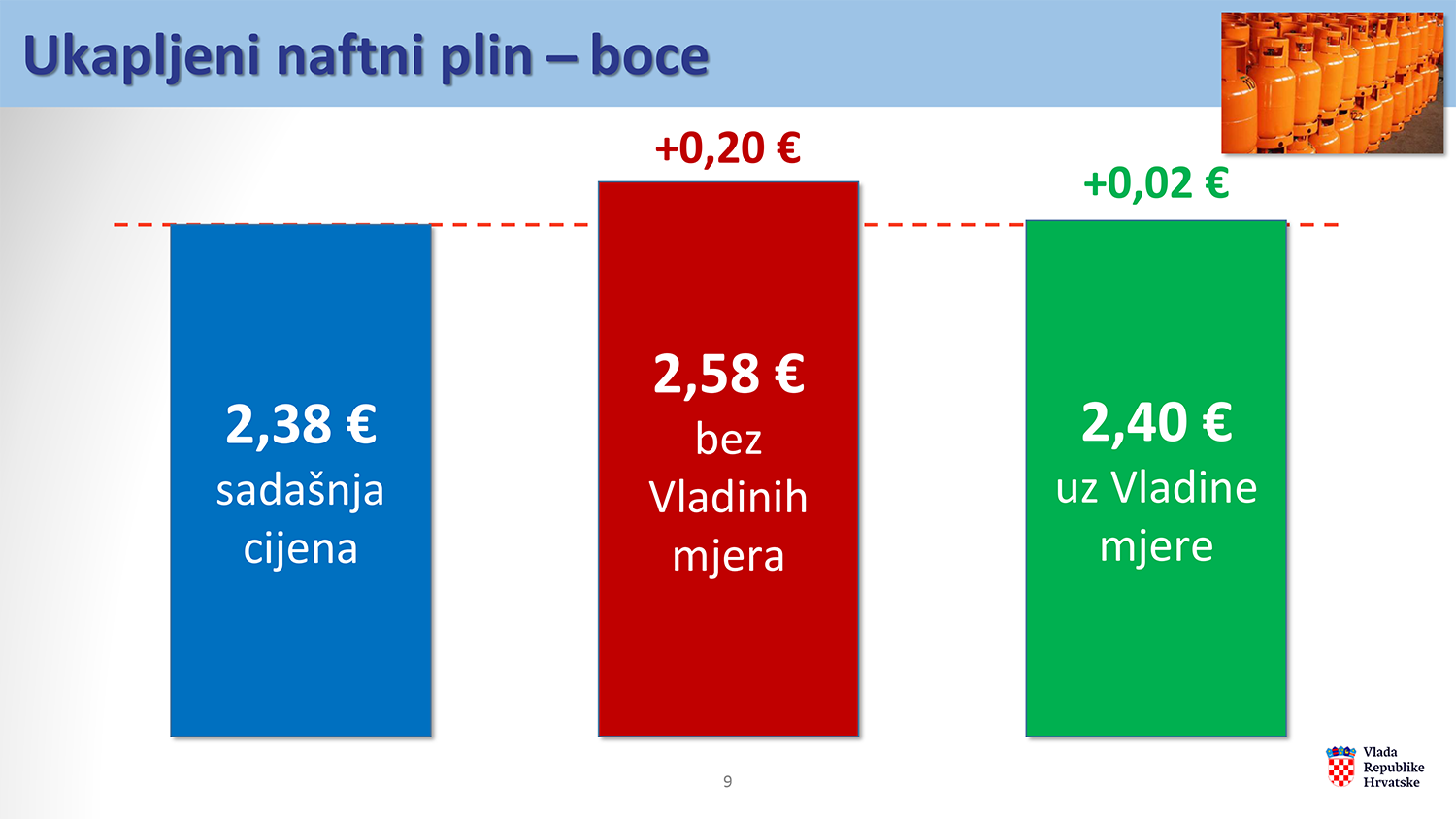 Kod ukapljenog naftnog plina u bocama, cijena bi bez mjera porasla s 2,38 eura na 2,58 eura po kg, dok će Vladinim intervencijama rast biti ograničen na 2,40 eura, odnosno 2 eurocenta.