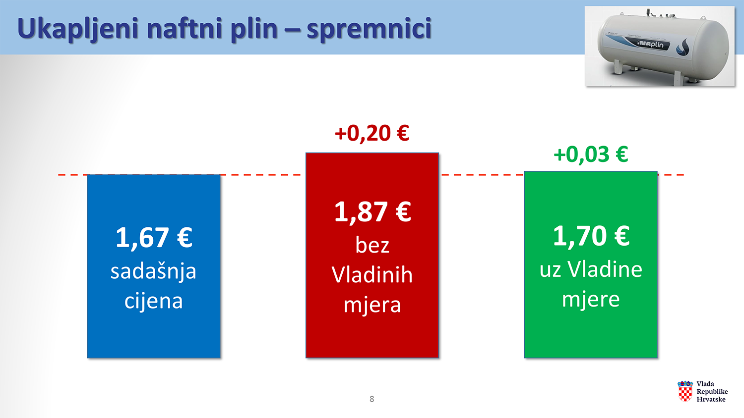 Cijena ukapljenog naftnog plina u spremnicima bez mjera Vlade porasla bi s 1,67 eura na 1,87 eura po kg, dok će uz Vladine mjere cijena biti 1,70 eura, odnosno rast će samo 3 eurocenta.