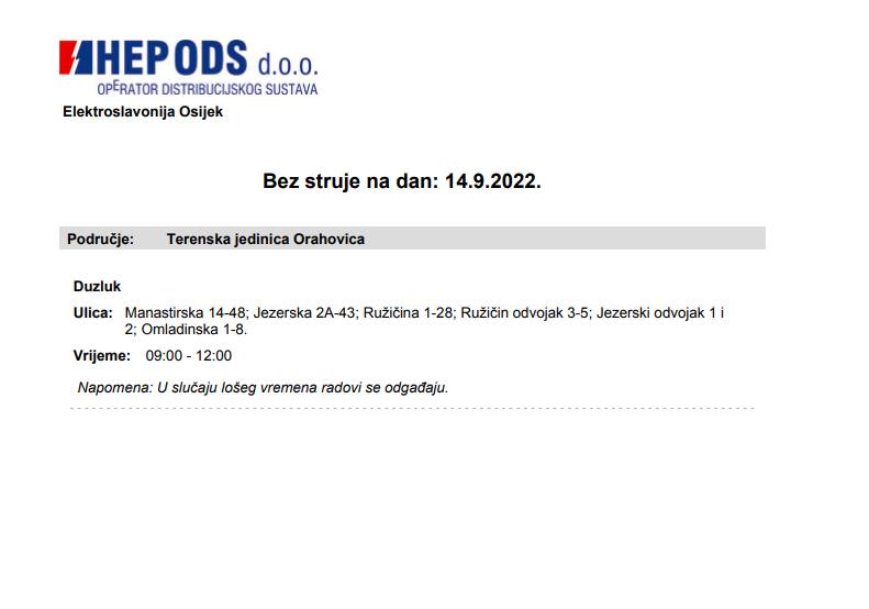Naslovnica Orahovica Obavijest iz HEP-a za danas Danijela Kalem 14. rujna 2022. About Post Author Danijela Kalem See author's posts Continue Reading Previous: Udruga S.O.S. Virovitica i Hrvatska udruga pripovjedača Pričalica danas su u središtu Orahovice proveli javnu akciju “Skini masku, otkrij nasilnika”Next: Općini Čačinci odobreno 223.000 kuna za nabavu spremnika za odvajanje otpada Related Stories Orahovica Promocija meteoslikovnica održat će se u četvrtak, 23. travnja. radio orahovica 16. travnja 2026. Orahovica POVJERENSTVO ZA ZAKUP POSLOVNIH PROSTORA radio orahovica 15. travnja 2026. Orahovica Orahovica na putu prema Mreži zdravih gradova. radio orahovica 14. travnja 2026.